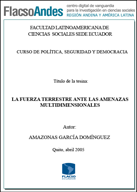 García Domínguez, Amazonas (2005). La fuerza terrestre ante las amenazas multidimensionales. Curso de Política, Seguridad y Democracia; FLACSO sede Ecuador. Quito. 58 p.
