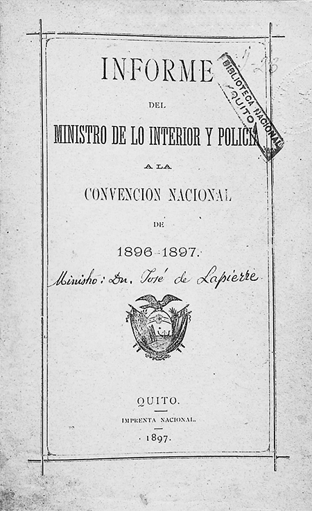 [ s.n ]. 1897. Informe del Ministro de lo Interior y Policía a la Convención Nacional de 1896 - 1897. Quito, Ecuador :Imprenta Nacional