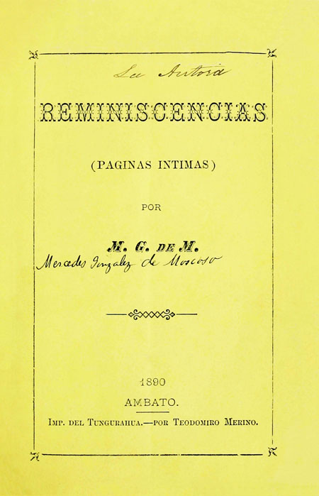 [González de Moscoso, Mercedes]. 1890. Reminiscencias (Paginas intimas) por M.G. de M. Ambato, Ecuador : Imprenta del Tungurahua. - Por Teodomiro Merino.