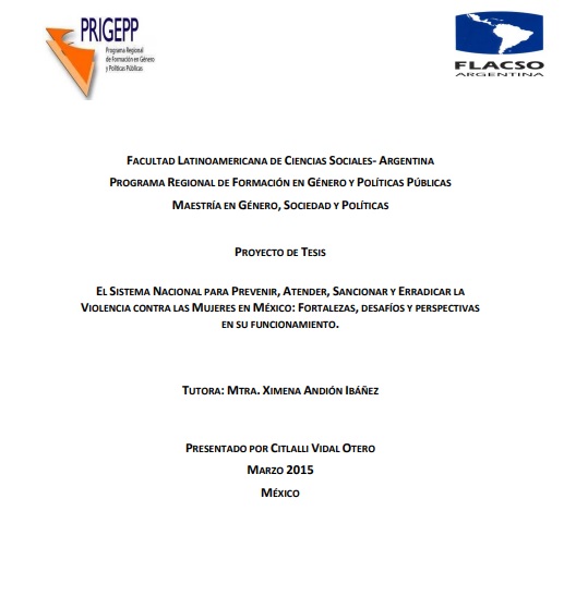 Vidal Otero, Citlalli (2015). El Sistema Nacional para Prevenir, Atender, Sancionar y Erradicar la Violencia contra las Mujeres en México : fortalezas, desafíos y perspectivas en su funcionamiento. Tesis de Maestría. FLACSO. Sede Académica Argentina, Buenos Aires.