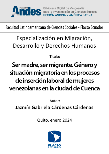 Cárdenas Cárdenas, Jazmín Gabriela. 2024. Ser madre, ser migrante. Género y situación migratoria en los procesos de inserción laboral de mujeres venezolanas en la ciudad de Cuenca. Tesina de especialización, Flacso Ecuador.