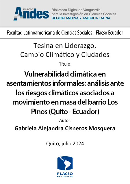 Cisneros Mosquera, Gabriela Alejandra. 2024. Vulnerabilidad climática en asentamientos informales: análisis ante los riesgos climáticos asociados a movimiento en masa del barrio Los Pinos (Quito - Ecuador). Tesina de especialización, Flacso Ecuador.
