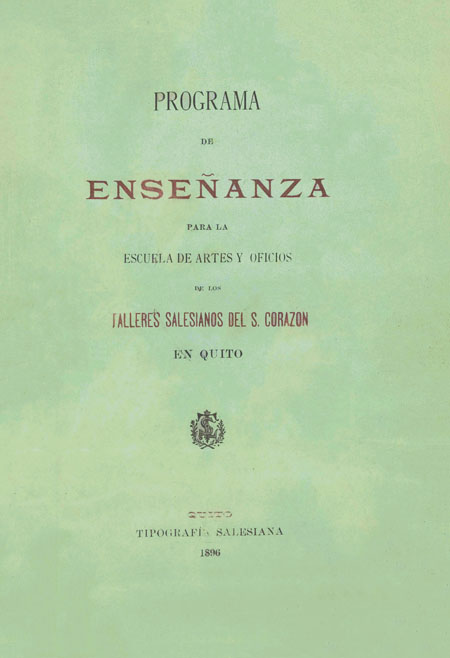 Programa de enseñanza para la Escuela de Artes y Oficios de los Talleres Salesianos del S. Corazón en Quito. 1896. Quito, Ecuador : Tipografía Salesiana.