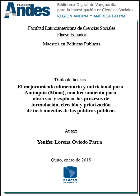 Oviedo Parra, Yenifer Lorena. 2015. El mejoramiento alimentario y nutricional para Antioquía (Mana), una herramienta para observar y explicar los procesos de formulación, elección y priorización de instrumentos de las políticas públicas. Tesis de maestría, Flacso Ecuador.