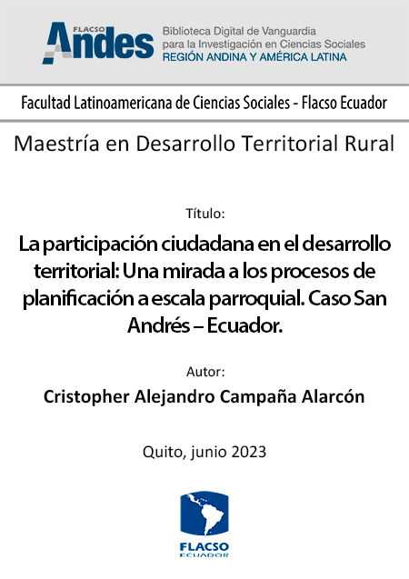 Campaña Alarcón, Cristopher Alejandro. 2023. La participación ciudadana en el desarrollo territorial: Una mirada a los procesos de planificación a escala parroquial. Caso San Andrés – Ecuador. Tesis de maestría, Flacso Ecuador.