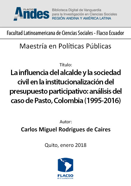Rodrigues de Caires, Carlos Miguel . 2018. La influencia del alcalde y la sociedad civil en la institucionalización del presupuesto participativo: análisis del caso de Pasto, Colombia (1995-2016). Tesis de maestría, Flacso Ecuador.