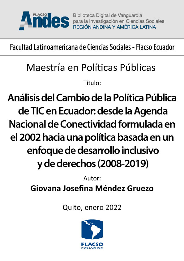 Méndez Gruezo, Giovana Josefina. 2022. Análisis del Cambio de la Política Pública de TIC en Ecuador: desde la Agenda Nacional de Conectividad formulada en el 2002 hacia una política basada en un enfoque de desarrollo inclusivo y de derechos (2008-2019). Tesis de maestría, Flacso Ecuador.