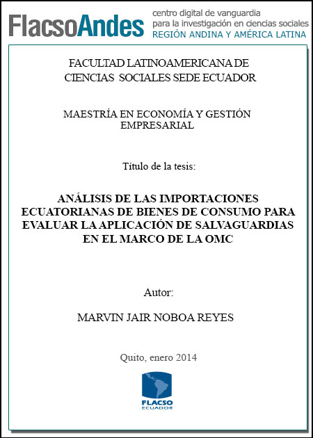 Noboa, M. J. (2014). Análisis de las importaciones ecuatorianas de bienes de consumo para evaluar la aplicación de salvaguardias en el marco de la OMC (Tesis de Maestría en Economía y Gestión Empresarial). FLACSO Sede Ecuador, Quito.
