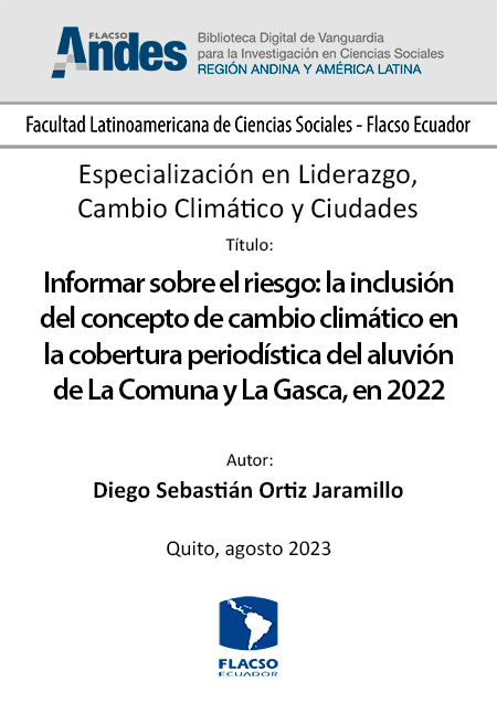 Ortiz Jaramillo, Diego Sebastián. 2023. Informar sobre el riesgo: la inclusión del concepto de cambio climático en la cobertura periodística del aluvión de La Comuna y La Gasca, en 2022. Tesina de especialización, Flacso Ecuador.