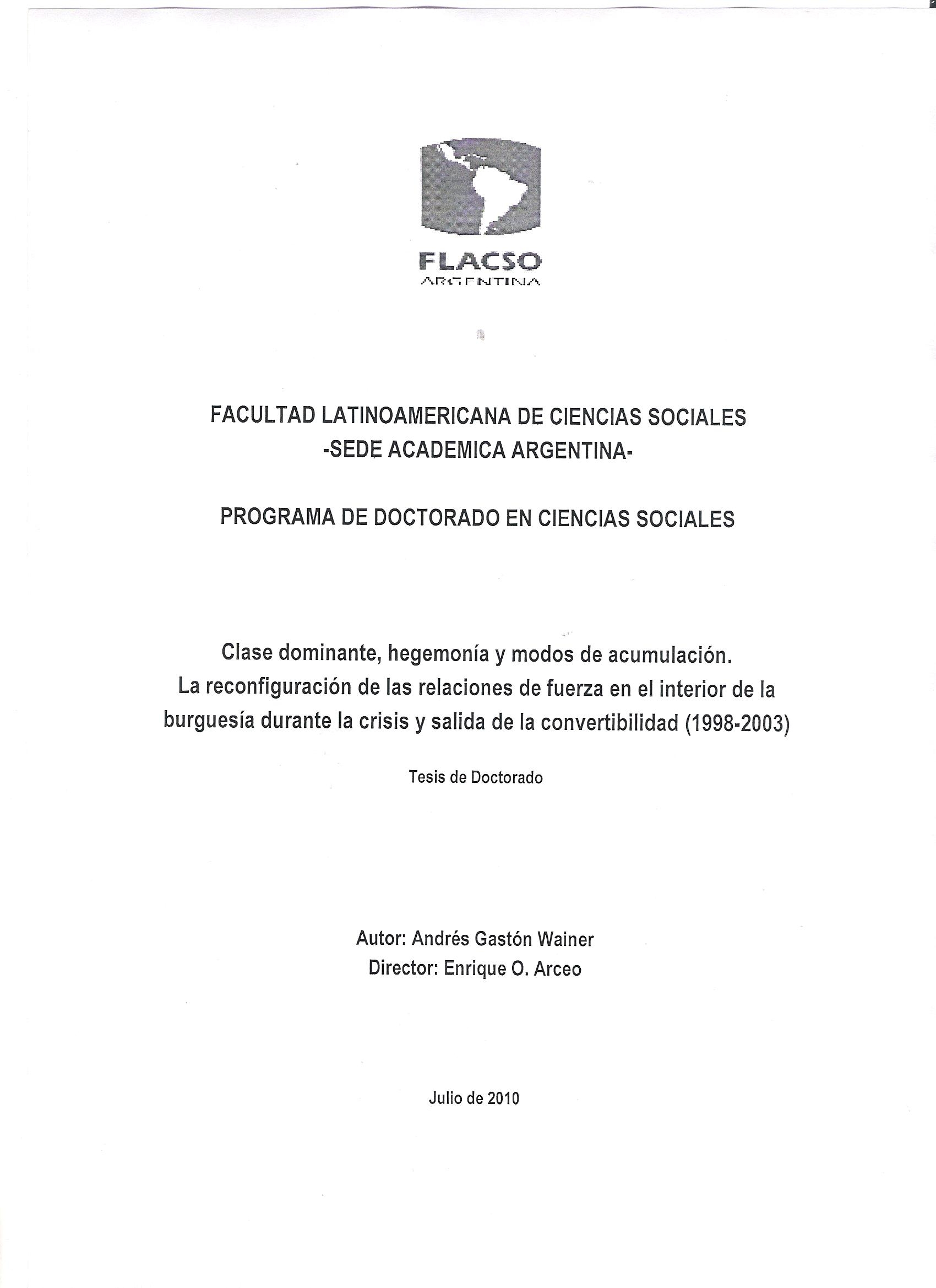 Wainer, Andrés Gastón (2010). Clase dominante, hegemonía y modos de acumulación : la reconfiguración de las relaciones de fuerza en el interior de la burguesía durante la crisis y salida de la convertibilidad, 1998 - 2003. Tesis de Doctorado. FLACSO. Sede Académica Argentina, Buenos Aires.