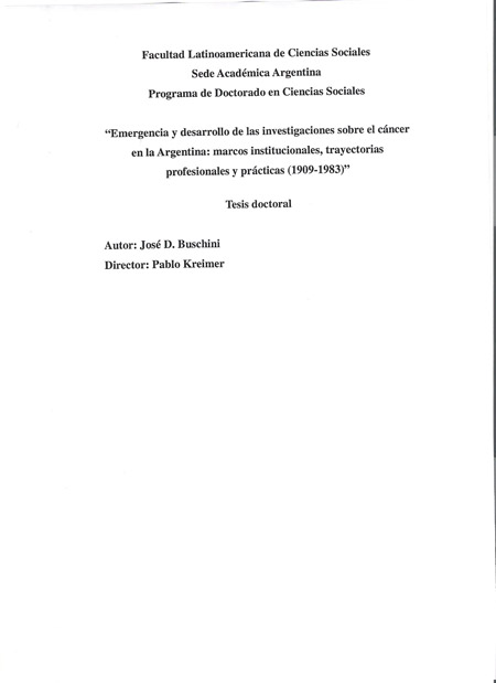 Buschini, José D. (2010). Emergencia y desarrollo de las investigaciones sobre el cáncer en la Argentina : marcos institucionales, trayectorias profesionales y prácticas, 1909 - 1983. Tesis de Doctorado. FLACSO. Sede Académica Argentina, Buenos Aires.