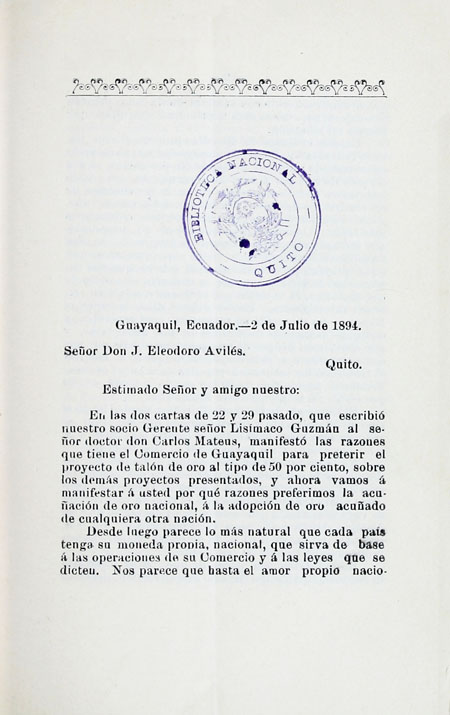 En las dos cartas de 22 y 29 pasado, que escribió nuestro socio Gerente señor Lisímaco Guzmán al señor doctor don Carlos Mateus, manifestó las razones que tiene el Comercio de Guayaquil para preterir el proyecto de talón de oro al tipo de 50 por ciento, sobre los demás proyectos presentados, y ahora vamos á manifestar á usted por qué razones preferimos la acuñación de oro nacional, á la adopción de oro acuñado de cualquiera otra nación.