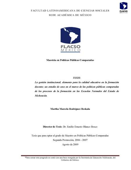 Rodríguez Reskala, Martha Marcela (2009). La gestión institucional, elemento para la calidad educativa en la formación docente : un estudio de caso en el marco de las políticas públicas comparadas de los procesos de la formación en las Escuelas Normales del estado de Michoacán. Maestría en Políticas Públicas Comparadas; FLACSO – Sede Académica de México. México. 209 h.