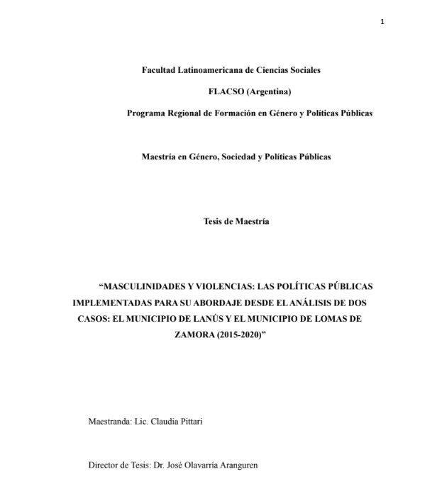 Pittari, Claudia (2022). Masculinidades y violencias : las políticas públicas implementadas para su abordaje desde el análisis de dos casos : el municipio de Lanús y el municipio de Lomas de Zamora ( 2015 - 2020). Tesis de Maestría. FLACSO. Sede Académica Argentina, Buenos Aires.