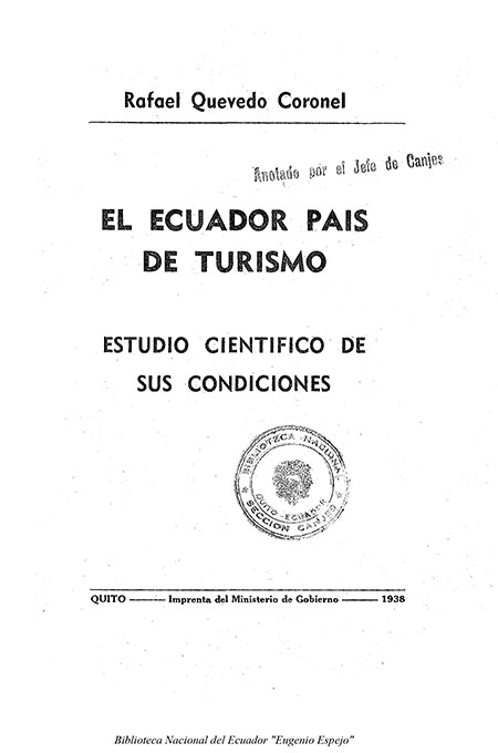Quevedo Coronel, Rafael . 1938. El Ecuador país de turismo : Estudio científico de sus condiciones. Quito : Imprenta del Ministerio de Gobierno.