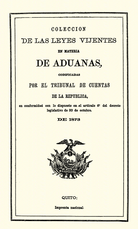 1873. Colección de las leyes vijentes en materia de aduanas, codificadas por el Tribunal de cuentas de la República, en conformidad con lo dispuesto en el artículo 6 del decreto legislativo de 30 de octubre de 1873. Quito, Ecuador : Imprenta Nacional.
