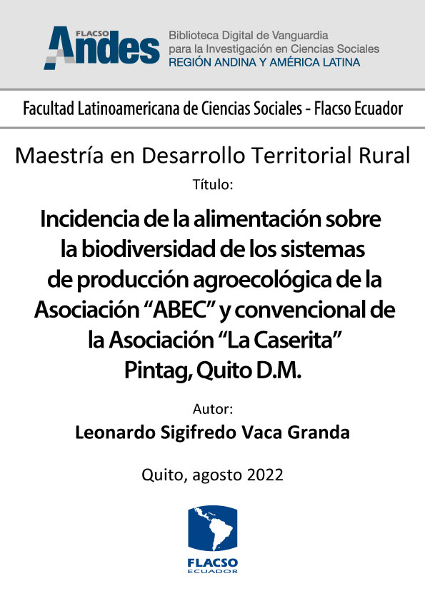 Vaca Granda, Leonardo Sigifredo. 2022. Incidencia de la alimentación sobre la biodiversidad de los sistemas de producción agroecológica de la Asociación “ABEC” y convencional de la Asociación “La Caserita” Pintag, Quito D.M. Tesis de maestría, Flacso Ecuador.