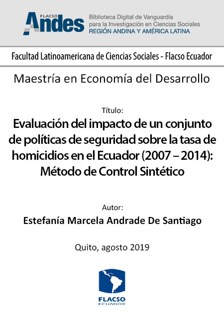 Andrade De Santiago, Estefanía Marcela. 2019. Evaluación del impacto de un conjunto de políticas de seguridad sobre la tasa de homicidios en el Ecuador (2007 – 2014): Método de Control Sintético. Tesis de maestría, Flacso Ecuador.