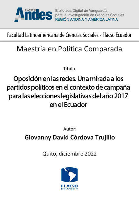 Córdova Trujillo, Giovanny David. 2022. Oposición en las redes. Una mirada a los partidos políticos en el contexto de campaña para las elecciones legislativas del año 2017 en el Ecuador. Tesis de maestría, Flacso Ecuador.