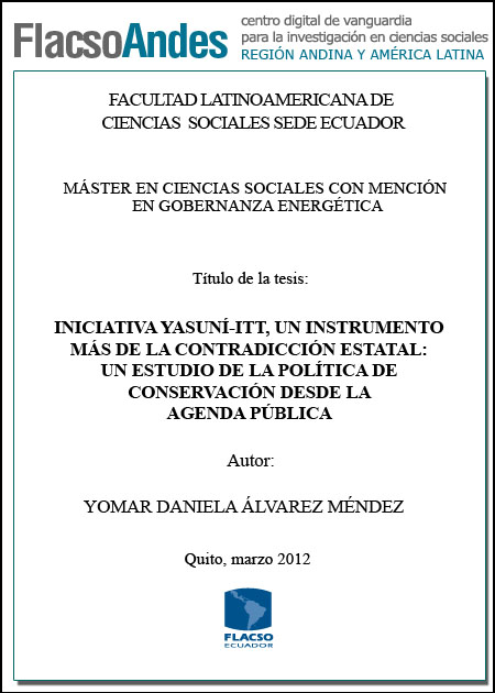 Álvarez Méndez, Yomar Daniela (2012). Iniciativa Yasuní-ITT, un instrumento más de la contradicción estatal : un estudio de la política de conservación desde la agenda pública. Maestría en Ciencias Sociales con mención en Gobernanza Energética; FLACSO Sede Ecuador. Quito. 132 p.