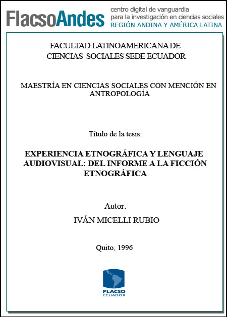 Micelli Rubio, Iván (1996). Experiencia etnográfica y lenguaje audiovisual: del informe escrito a la ficción etnográfica. Maestría en Antropología; FLACSO sede Ecuador. Quito 208 p.