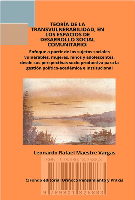 Maestre Vargas, Leonardo Rafael. 2025. Teoría de la transvulnerabilidad, en los espacios de desarrollo social comunitario: enfoque a partir de los sujetos sociales vulnerables, mujeres, niños y adolescentes, desde sus perspectivas socio productiva para la gestión político-académica e institucional. Bolívar : Fondo editorial Orinoco Pensamiento y Praxis.
