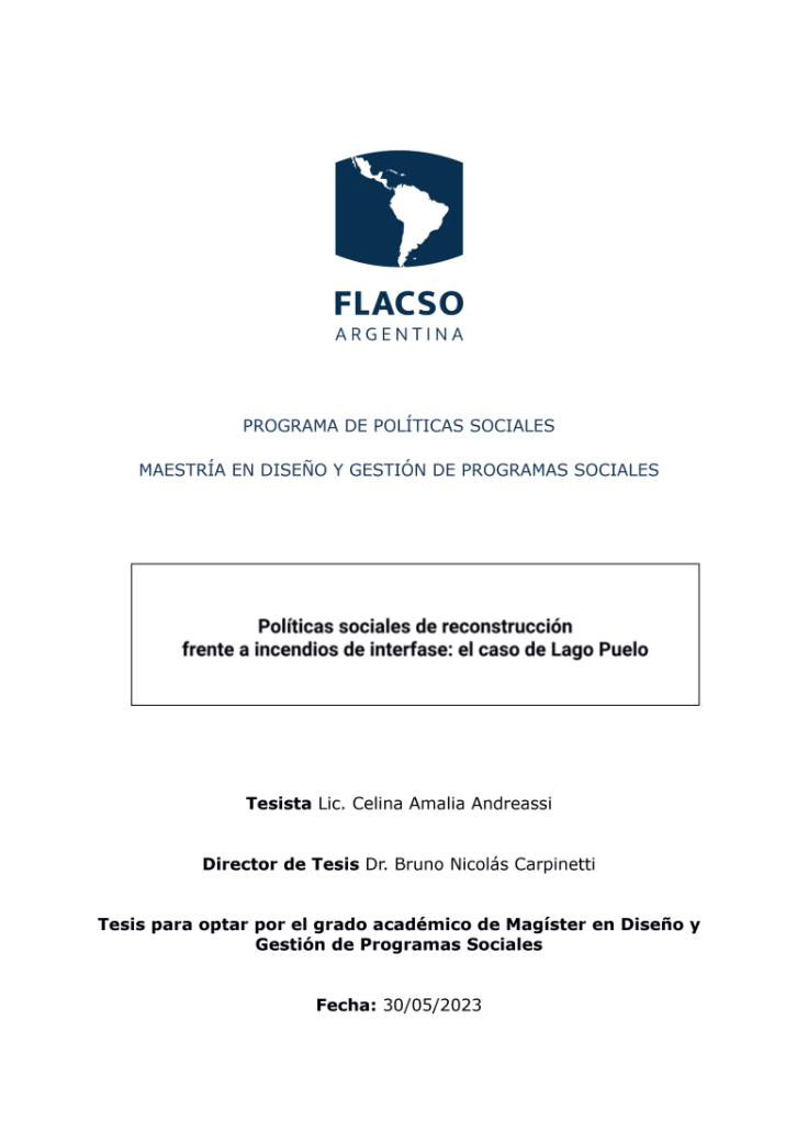 Andreassi, Celina Amalia (2023). Políticas sociales de reconstrucción frente a incendios de interfase: el caso de Lago Puelo. Tesis de Maestría. FLACSO. Sede Académica Argentina, Buenos Aires.