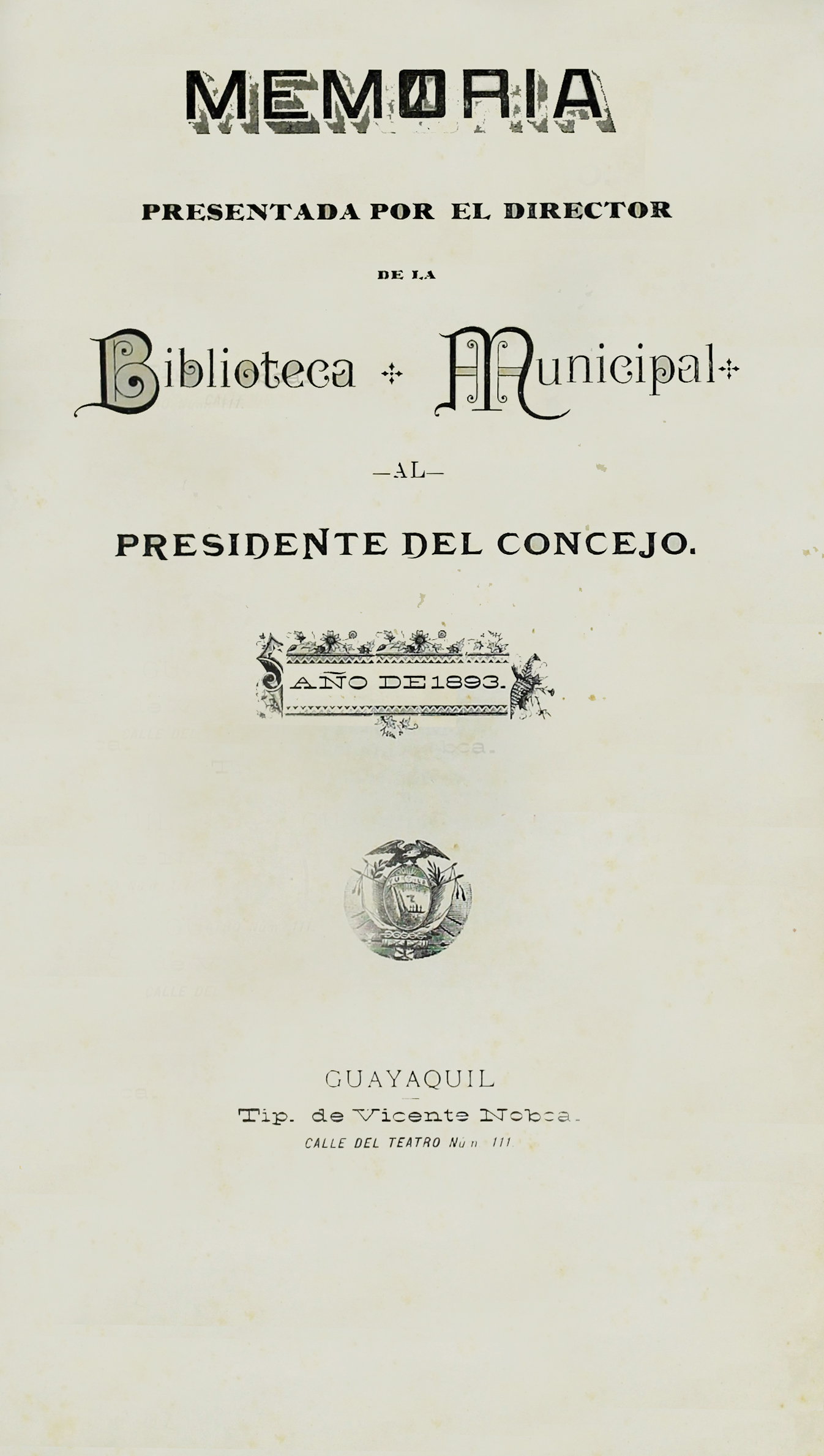 Biblioteca Municipal de Guayaquil. 1893. Memoria presentada por el Director de la Biblioteca Municipal al Presidente del Concejo : Año 1893. Guayaquil, Ecuador : Tip. de Vicente Noboa.