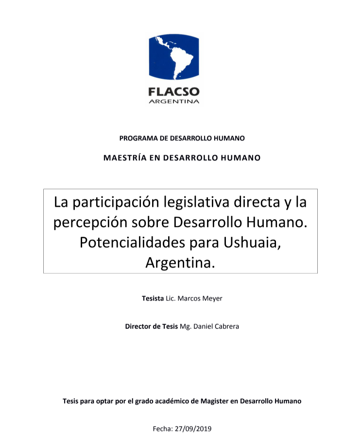 Meyer, Marcos. 2019. La participación legislativa directa y la percepción sobre Desarrollo Humano : potencialidades para Ushuaia, Argentina. Tesis de Maestría. FLACSO. Sede Académica Argentina, Buenos Aires.