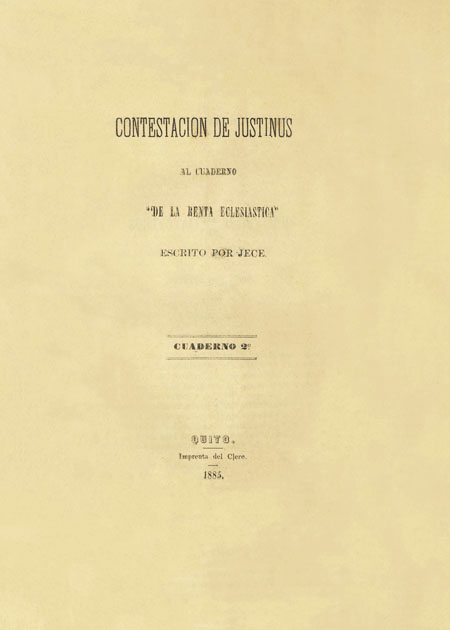 Jece. 1885. Contestación de Justinus al cuaderno "De la renta eclesiástica" (Continuación). Quito, Ecuador : Imprenta del Clero.