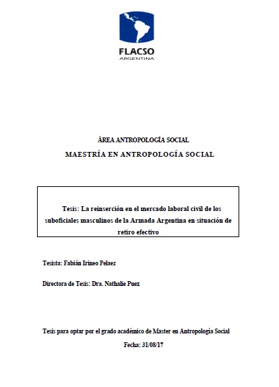 Pelaez, Fabián Irineo (2017). La reinserción en el mercado laboral civil de los suboficiales masculinos de la Armada Argentina en situacion de retiro efectivo. Tesis de Maestría. FLACSO. Sede Académica Argentina, Buenos Aires