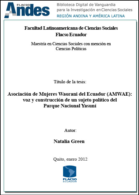 Green, Natalia. 2012. Asociación de Mujeres Waorani del Ecuador (AMWAE): voz y construcción de un sujeto político en la dinámica del Parque Nacional Yasuní. Tesis de maestría, Flacso Ecuador.