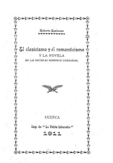 Espinosa, Roberto . 1911. El clasicismo y el romanticismo y la novela en las escuelas modernas literarias. Cuenca : Imp. de La Unión Literaria.