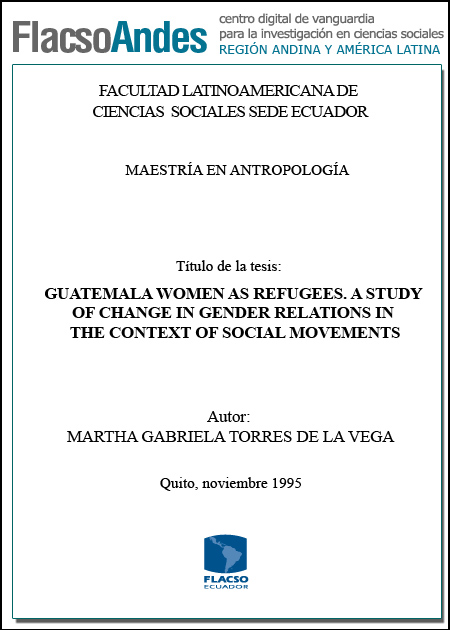 Torres de la Vega, Martha Gabriela (1995). Guatemala women as refugees. A study of change in gender relations in the context of social movements. MaestrĂa en AntropologĂa, FLACSO Sede Ecuador. Quito. 103 p.