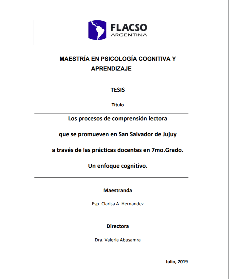 Hernandez, Clarisa A. (2019). Los procesos de comprensión lectora que se promueven en San Salvador de Jujuy a través de las prácticas docentes en séptimo grado : un enfoque cognitivo. Tesis de Maestría. FLACSO. Sede Académica Argentina, Buenos Aires.