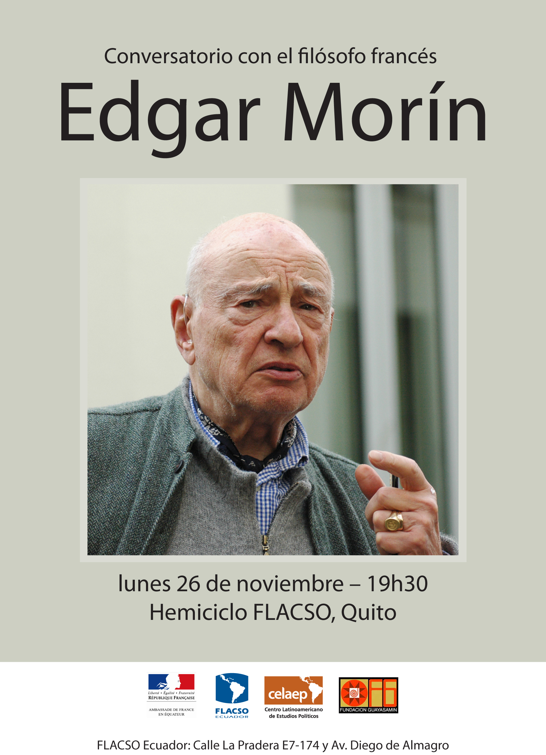 Afiche promocional del Conversatorio con el filósofo francés Edgar Morín, realizado el 26 de noviembre de 2012 en Flacso sede Ecuador, con la colaboración de: Embajada de Francia en Ecuador, Centro Latinoamericano de Estudios Políticos (CELAEP) y Fundación Guayasamín.
