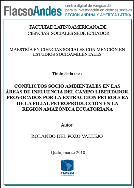 Pozo Vallejo, Rolando del (2010). Conflictos socio ambientales en las áreas de influencia del campo Libertador, provocados por la extracción petrolera en la filial Petroproducción en la región amazónica ecuatoriana. Maestría en Ciencias Sociales con mención en Estudios Socioambientales, FLACSO Sede Ecuador. Quito, 122 p.