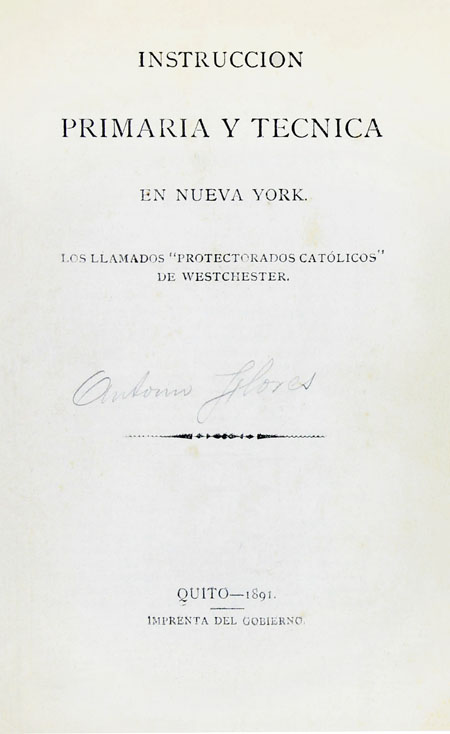 Flores Jijón, Antonio. 1891. Instrucción primaria y técnica en Nueva York. Los llamados "Protectorados Católicos" de Westchester. Quito, Ecuador : Imprenta del Gobierno.