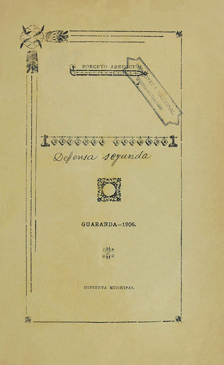 Arregui Moscoso, Roberto. 1906. Defensa Segunda. Guaranda, Ecuador : Imprenta Nacional.