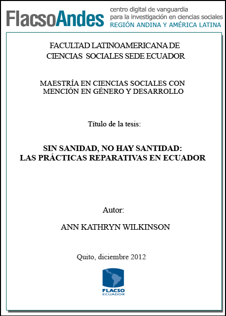 Wilkinson, Ann Kathryn (2012). Sin sanidad, noy hay santidad : las prácticas reparativas en Ecuador. Maestría en Ciencias Sociales con mención en Género y Desarrollo, FLACSO Sede Ecuador. Quito, 267 p.