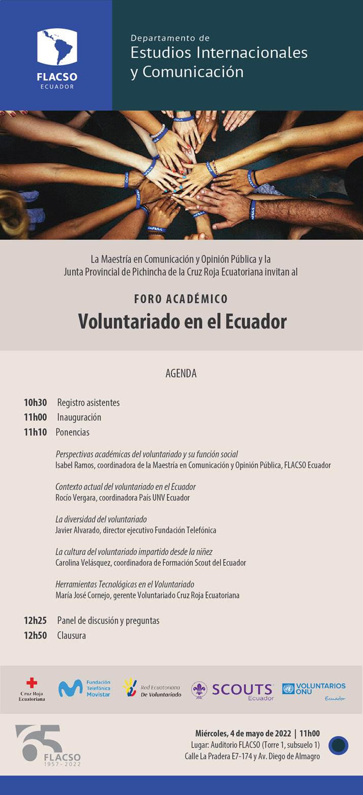 FLACSO Ecuador : Estudios Internacionales y Comunicación – Foro académico Voluntariado en el Ecuador, 7 de mayo de 2022 - 11:00 – 13:00 - FLACSO Ecuador, Quito. Un evento organizado por la Maestría en Comunicación y Opinión Pública y la Junta Provincial de Pichincha de la Cruz Roja Ecuatoriana.