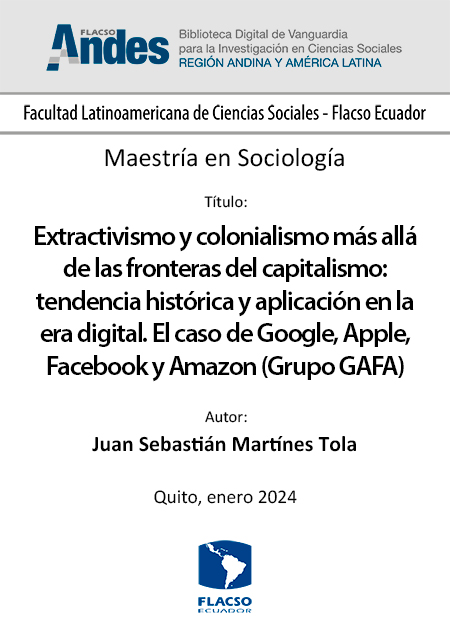 Martínes Tola, Juan Sebastián. 2024. Extractivismo y colonialismo más allá de las fronteras del capitalismo: tendencia histórica y aplicación en la era digital. El caso de Google, Apple, Facebook y Amazon (Grupo GAFA). Tesis de maestría, Flacso Ecuador.