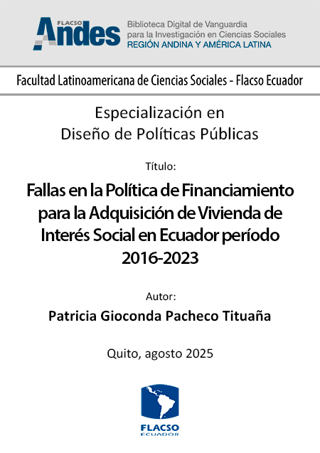 Pacheco Tituaña, Patricia Gioconda. 2025. Fallas en la Política de Financiamiento para la Adquisición de Vivienda de Interés Social en Ecuador período 2016-2023. Tesina de especialización, Flacso Ecuador.