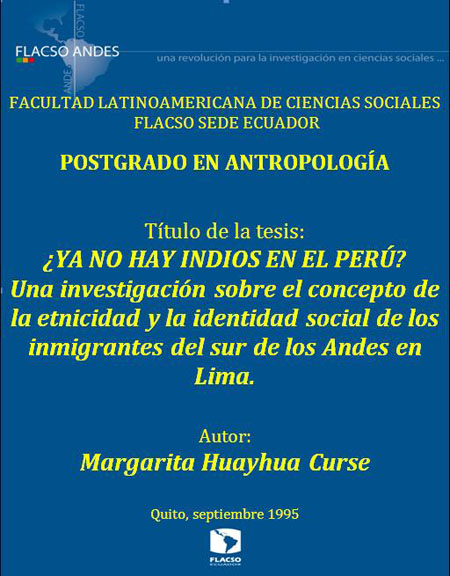 Huayhua Curse, Margarita (1995). ¿Ya no hay indios en el Perú?, una investigación sobre el concepto de la etnicidad y la identidad social de los migrantes del sur de los Andes en Lima. Maestría en Antropología, FLACSO Sede Ecuador. Quito.
