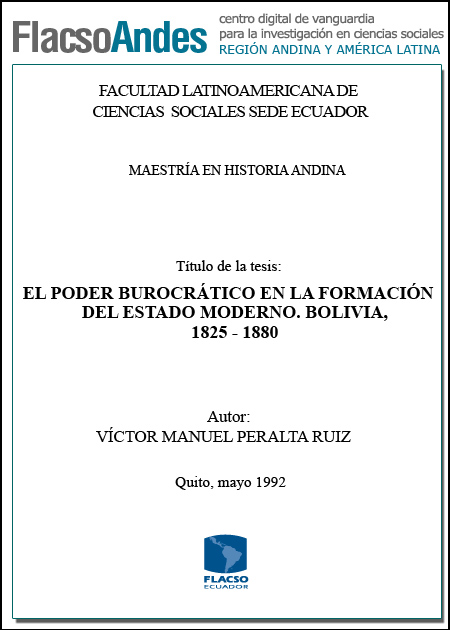 Peralta Ruiz, Víctor Manuel. (1992). El poder burocrático en la formación del estado moderno: Bolivia, 1825-1880. Maestría en Historia Andina; FLACSO - Sede Ecuador. Quito. 132 p.