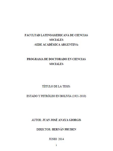 Anaya Giorgis, Juan José. (2016). Estado y petróleo en Bolivia : 1921 - 2010. Tesis de Doctorado. FLACSO. Sede Académica Argentina, Buenos Aires.