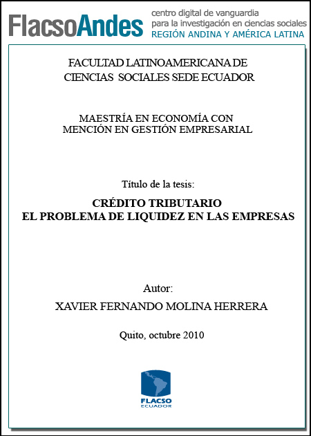 Molina Herrera, Xavier Fernando (2010). Crédito tributario : el problema de liquidez en las empresas, Maestría en Economía con mención en Gestión Empresarial, FLACSO Sede Ecuador. Quito, 91 p.