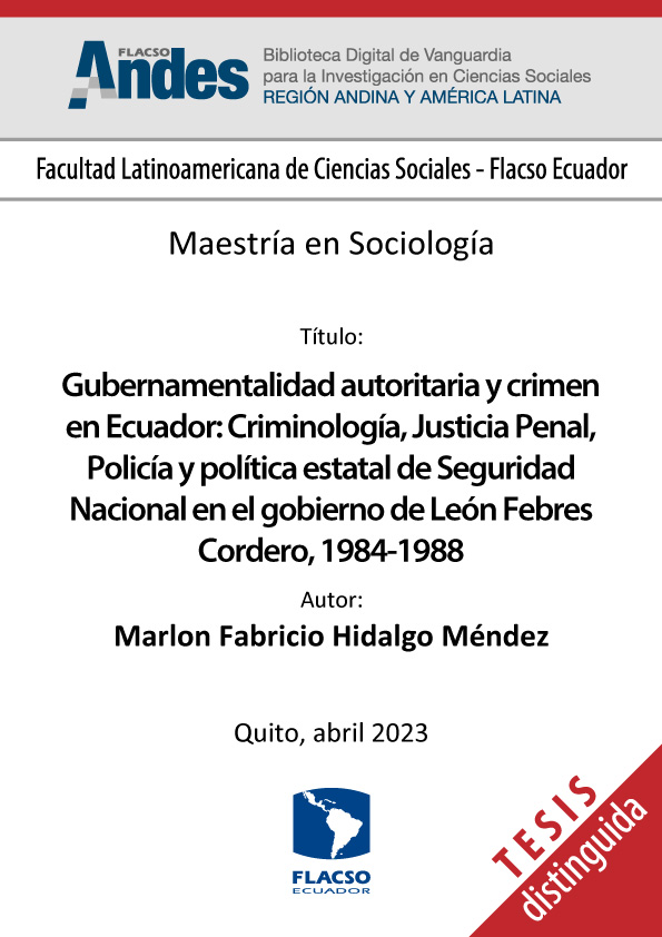 Hidalgo Méndez, Marlon Fabricio. 2023. Gubernamentalidad autoritaria y crimen en Ecuador: Criminología, Justicia Penal, Policía y política estatal de Seguridad Nacional en el gobierno de León Febres Cordero, 1984-1988. Tesis de maestría, Flacso Ecuador.