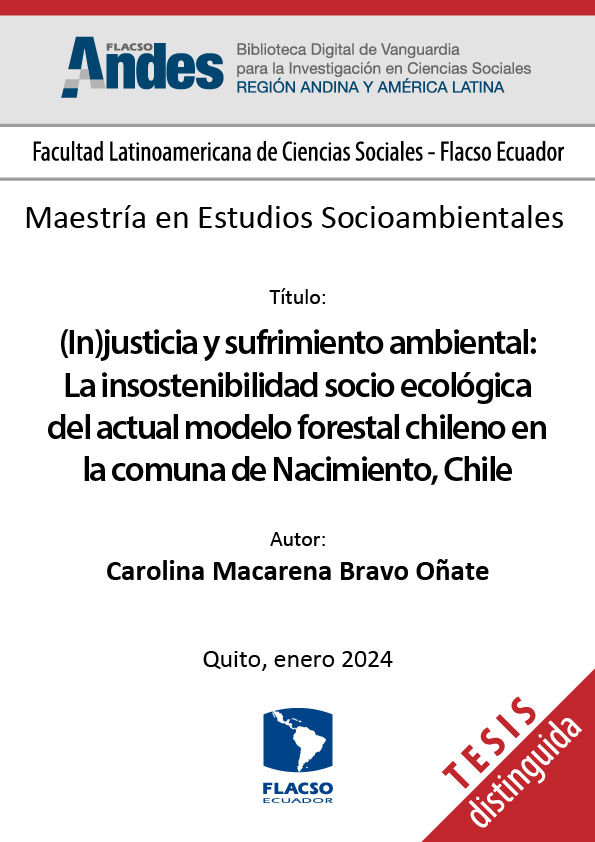 Bravo Oñate, Carolina Macarena. 2024. (In)justicia y sufrimiento ambiental: La insostenibilidad socio ecológica del actual modelo forestal chileno en la comuna de Nacimiento, Chile. Tesis de maestría, Flacso Ecuador.