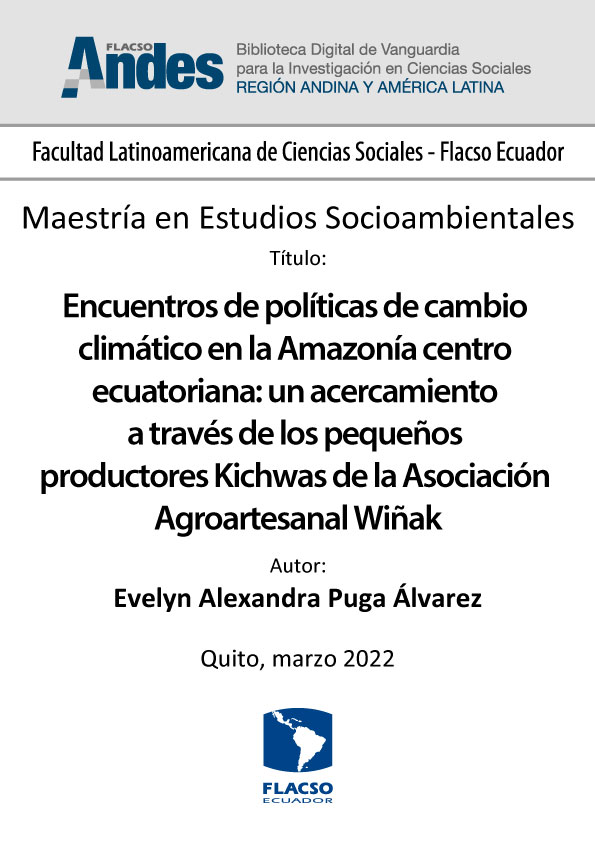 Puga Álvarez, Evelyn Alexandra. 2022. Encuentros de políticas de cambio climático en la Amazonía centro ecuatoriana: un acercamiento a través de los pequeños productores Kichwas de la Asociación Agroartesanal Wiñak. Tesis de maestría, Flacso Ecuador.